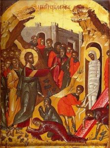 Στην εικονογραφία βλέπουμε τον τάφο του Λαζάρου ανάμεσα σε βράχους που σχηματίζουν μια σπηλιά, καλύπτοντας την ένας ογκόλιθος. Ο Ιησούς στέκει μπροστά από το μνήμα ζητώντας την τεράστια πέτρα που το σφραγίζει να απομακρυνθεί. Με το δεξί του χέρι ευλογεί και καλεί το Λάζαρο να «ξυπνήσει» και να εξέλθει του μνήματος. Ο Λάζαρος εικονογραφείται περιτυλιγμένος και δεμένος στα χέρια και στα πόδια από βαμβακερό ύφασμα. Ο Ιησούς δίνει εντολή να τον λύσουν και να τον αφήσουν να περπατήσει. Στην εικόνα βλέπουμε μπροστά από το Λάζαρο την πέτρα που έχει μετακινηθεί από το μνήμα και το λύσιμο του σάβανου που τον είχαν τυλίξει.